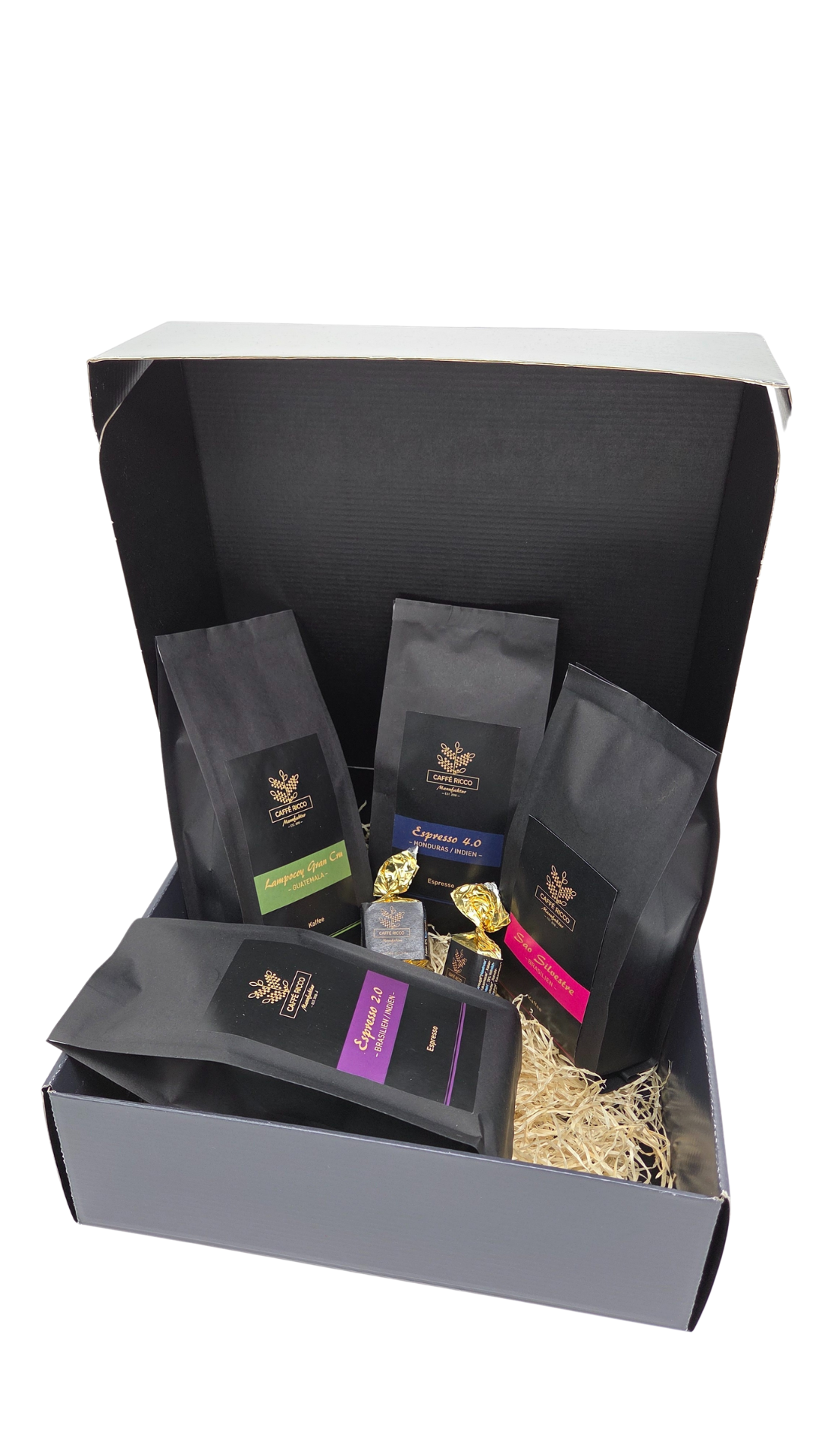 Ein Geschenk für alle, die Kaffee lieben. Unsere Caffé Ricco Geschenkbox vereint handwerklich geröstete Spitzenkaffees in eleganter Verpackung – liebevoll zusammengestellt und mit rotem Band veredelt, bereit zum Verschenken.